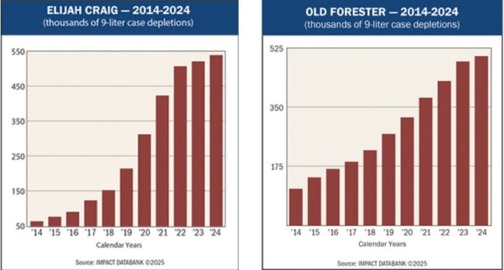 Within the remaining Blue Chip whiskies, seven are from the U.S., along with one Canadian and one Scotch whisky. Heaven Hill’s Evan Williams reached 3.05 million cases in 2024. The accessibly-priced Bourbon has added over a million cases since 2014, averaging 8.4% growth from 2014 to 2019 and 1.8% since then. Elijah Craig, also owned by Heaven Hill, is one of the newly minted Blue Chip brands, reaching 541,000 cases last year. “We’re seeing a migration from ultra-premium to premium and super-premium tiers, driven by what we call smart indulgence,” says Susan Wahl, vice president of American whiskey at Heaven Hill Brands. “People still want to treat themselves, but they’re prioritizing quality and meaning over excess.”