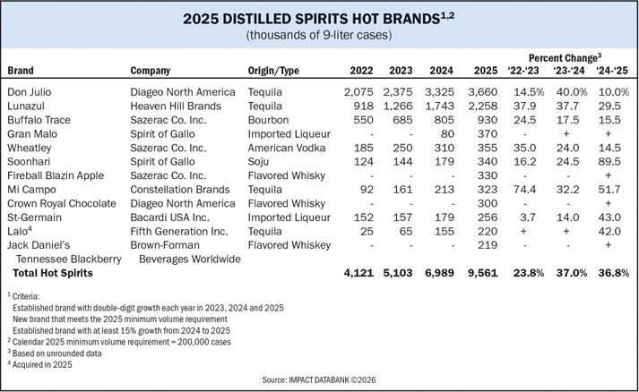 Thirteen spirits labels earned Hot Brand honors for 2025, with Tequila brands leading the way once again. This year’s list, while smaller than in recent years, shows that despite industry headwinds there are still full-strength spirits brands finding ways to make strong connections with consumers. Overall, these winning brands totaled 9.6 million cases on 37% growth in 2025. Beyond Tequilas, three flavored whiskies and two liqueurs made the list, with one Bourbon, one American vodka, and one soju brand also represented among the Hot Brand winning labels.
