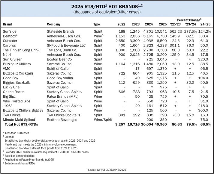 The winning RTDs range in size from over 10 million cases for Stateside Brands’ Surfside, the largest winner, down to 350,000 cases for Redtree Beverages’ Minute Maid Spiked, which earned its first honor for its 2025 performance. The majority of the Hot Brand-winning RTDs are canned (or in other individual-sized packaging), with only Suntory Global Spirits’ On The Rocks and Sazerac’s Biggies Buzzballz representing the larger-format ready-to-serve cocktail segment.