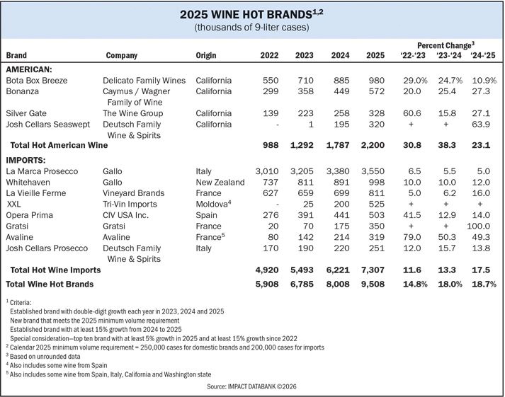 The second-largest brand on the domestic wines list is Bonanza, the fast-rising California label from the Wagner Family of Wine. Bonanza has nearly doubled in size in the past three years. Last year, Bonanza introduced two new wines, including The Vinekeeper—a new Cabernet that will highlight various California wine regions—and a Chardonnay. Bonanza blew past projections last year, nearing 600,000 cases in the U.S., according to Impact Databank. Also earning a Hot Brand from the domestic side is Silver Gate from The Wine Group, an on-premise-focused label that topped 300,000 cases in 2025, accelerating from the prior year despite the tough conditions.