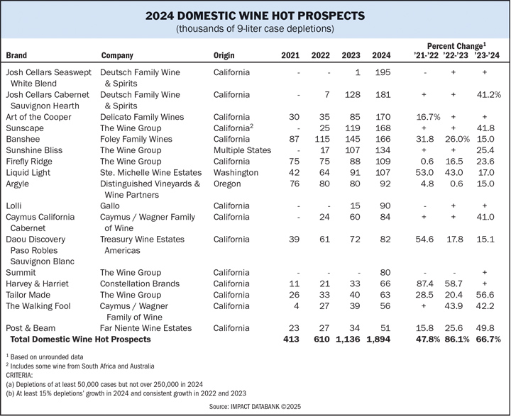 Impact’s annual Hot Prospects for wine feature 17 fast-rising domestic wines—with all but one making their debut on this year’s list—and 11 imports posting impressive volume gains. Total domestic wines in the 2024 Hot Prospects lineup collectively grew 66.7% to 1.89 million cases in the U.S. last year, according to Impact Databank. Most domestic awardees hail from California, including the top two entrants from Josh Cellars, but Washington and Oregon are represented as well.