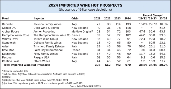 New Zealand wine Stoneleigh was another returning imported Hot Prospect wine, after growing 23.1% to 80,000 cases last year, double its 2022 volume. Stoneleigh is positioned for continued growth under its new owner, Vinarchy. Terlato-imported Wairau River, also from New Zealand, has kept up a torrid pace lately, nearly tripling in size over the past three years. Another kiwi brand, Opici-imported Giesen 0%, represents the growing non-alcohol segment, having surged to nearly 120,000 cases.