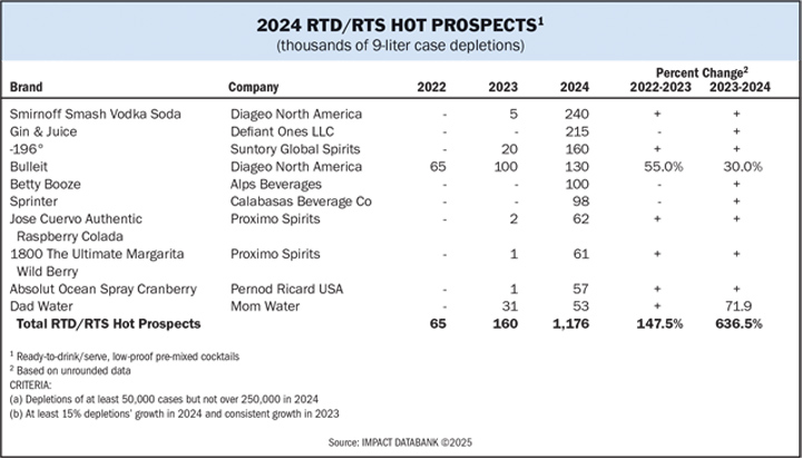 Proximo Spirits earned two Hot Prospect RTS nods in 2024 with a pair of more traditional offerings: Jose Cuervo Authentic Raspberry Colada and 1800 The Ultimate Margarita Wild Berry. Both brands performed well in their first full year of wide availability, with the Cuervo release at 62,000 cases and 1800’s latest flavored Margarita at 61,000. Rounding out this year’s spirits-based RTD Hot Prospects are Pernod Ricard’s Absolut Ocean Spray Cranberry cocktails and Mom Water’s Dad Water. Pernod’s winner reached 57,000 cases in its first full year on the market. Dad Water, the only non-carbonated canned drink on this year’s list, grew 72% to 53,000 cases. The brand is an offshoot of Mom Water, the non-carbonated vodka-based fruit-flavored RTD label.