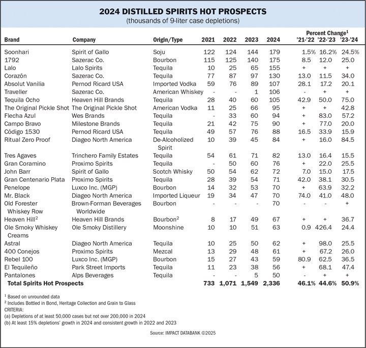 Every year, Market Watch and sister publication Impact Newsletter highlight the fastest growing smaller brands throughout the wine and spirits industry with the “Hot Prospects” awards, spotlighting the up-and-coming players poised to become significant growth drivers in the years ahead. This year, a total of 64 brands from the wine, spirits, and RTD cocktail categories met Impact Databank’s criteria to earn honors. To qualify as Hot Prospects, brands must have achieved at least 15% depletions growth for 2024, while also showing consistent growth in the two preceding years. For spirits and imported wines, brand volumes must be between 50,000 and 200,000 cases, while domestic wine and RTD volumes must be between 50,000 and 250,000 cases.